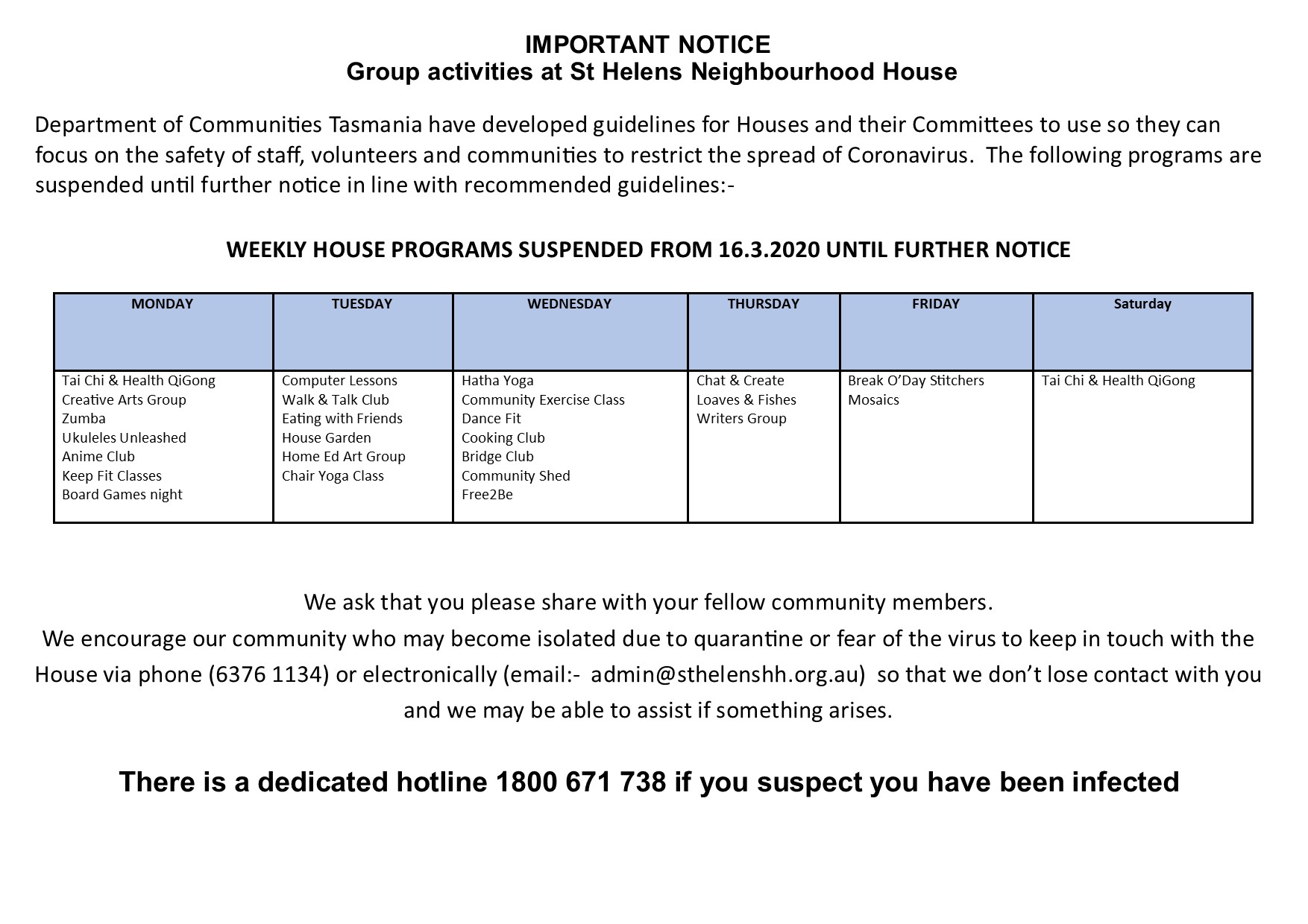 suspended programs 16.3.2020 Posted on March 16, 2020March 16, 2020 by Rebecca Tuck ← Previous Next →